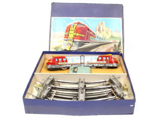 dimensions du coffret : 33 x 32 cm - contient : une motrice diesel à 2 éléments (fonctionne - quelques frottements par endroits), un boîtier de commandes, 8 rails (légèrement ternies) & cale de boîte - boîte tachée