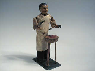 les vêtements & les outils que tient le personnage ne sont pas d'origine - petites retouches de peinture - il pourrait s'agir d'une transformation sur la base d'un autre automate - le mécanisme ne fonctionne pas - fabrication début 1900