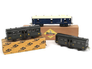 comprend : un wagon fourgon à bagages (proche de l'état 'A-' avec petits frottements & très légères déformations par endroits) & voiture de voyageurs de 3ème classe (2 exemplaires dont un sans boîte, carrosseries en plastique)