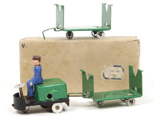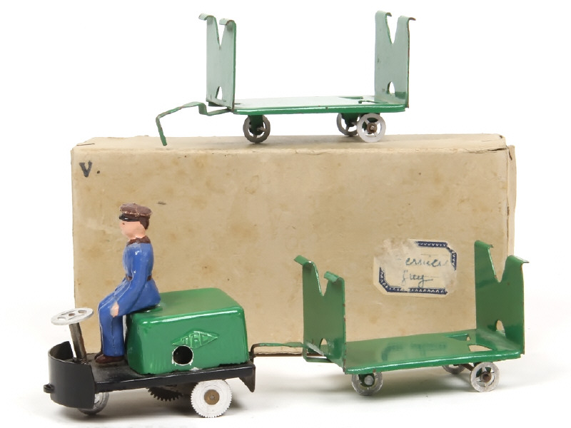 longueur de l'ensemble : 28 cm - réalisation en tôle peinte avec conducteur - moteur à clef (à revoir) - boîte tachée (une étiquette collée sur le couvercle) - quelques éclats plus ou moins importants par endroits