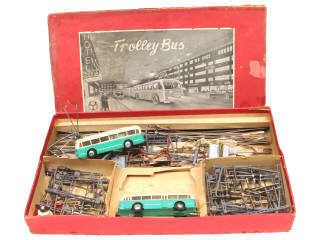 contient : un trolleybus à 2 éléments (moteur non testé) & différents accessoires - carrosseries plus ou moins déformées par endroits - possibilité de petits accessoires manquants & d'autres cassés