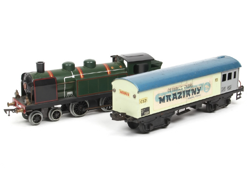 moteur électrique (fonctionne) - train avant désolidarisé - on y joint un wagon fourgon frigorifique de la marque MERKUR (état 'D' avec publicités incomplètes & traces d'oxydation)