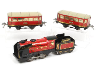 comprend : locomotive carénée avec tender (moteur à clé à revoir) & 2 voitures voyageurs - quelques frottements plus ou moins importants par endroits