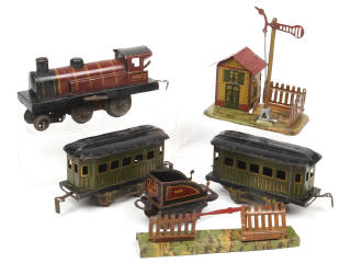 comprend : locomotive 120 avec moteur à clé (fonctionne, avec clé), tender, 2 voitures voyageurs & un passage à niveau - importantes traces d'oxydation, déformations & quelques manques par endroits
