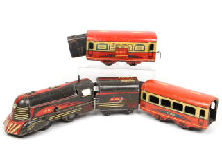 comprend : locomotive à vapeur carénée avec tender (moteur à clé, fonctionne), voiture voyageurs & fourgon à bagages - nombreux frottements & traces d'oxydation - quelques parties déformées & éléments manquants