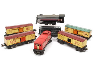 écartement '0' - états de 'B' à 'E' - non testé - locomotive à vapeur avec tender 'UNION PACIFIC', wagon-fourgons (5 exemplaires dont un postal) - on y retrouve les marques : LIONEL & MARX TOYS - traces d'oxydation avec quelques manques
