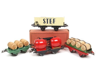 'GB & FRANCE' - états de 'A-' à 'B' - comprend : wagon-porte fûts (2 exemplaires différents), double foudre & fourgon frigorifique 'STEF' (en boite état 'b')