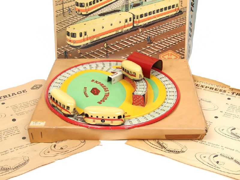 comprend : motrice mécanique (moteur à clé fonctionne), 2 voitures & d'un circuit en tôle lithographié (très légers enfoncements) - avec notices - quelques manques de peinture par endroits principalement sur le matériel roulant