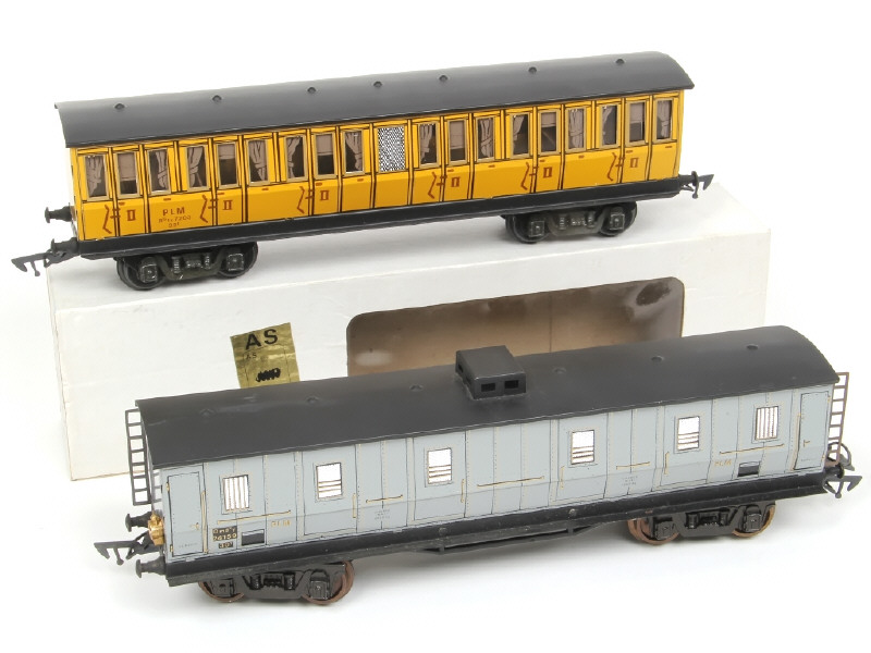 comprend : voiture voyageurs de 2ème classe & fourgon à bagages PLM - quelques frottements sur les languettes de contact électrique - un blister de boite manquant