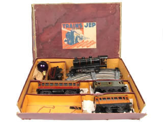 dimensions du coffret : 47 x 37 cm - contient : une locomotive à vapeur type 120 avec tender (moteur à clef fonctionne, coffret non conforme), 2 voitures voyageurs, un fourgon à bagages, 4 rails courbes (oxydation) & une ampoule - quelques petits frottements & éclats par endroits