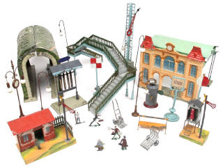 réalisation du début du XXème siècle - dimensions : 55 x 55 cm - contient notamment : tunnel, passerelle, gare, signaux, guérite, indicateur de direction et accessoires divers (certains non d'origine) - manques de peinture plus ou moins importants par endroits avec petites déformations & éléments désolidarisés & d'autres en état 'E' - quelques petits manques - coffret non présenté sur la photo