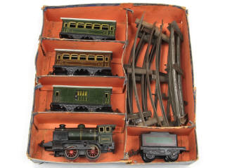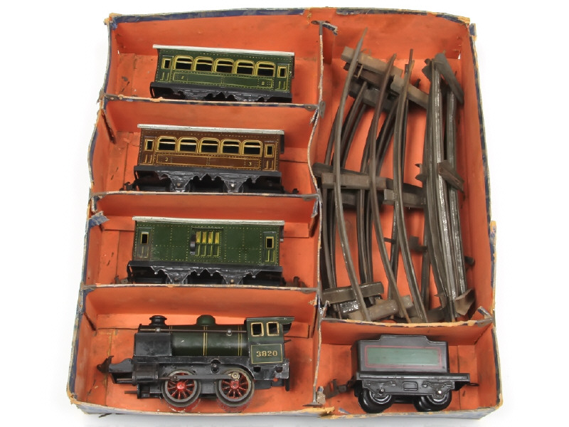 écartement '0' - comprend : locomotive 020 avec moteur mécanique (fonctionne) & tender - 2 voitures voyageurs, un fourgon à bagages & 9 rails - traces d'oxydation & parties plus ou moins déformées