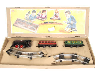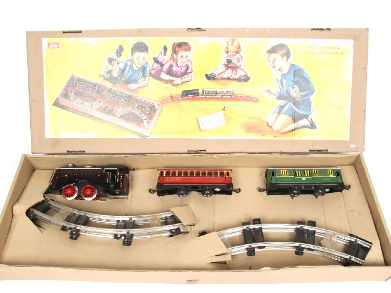 écartement '0' - reproduction de 1997, avec certificat d'édition limitée n°415/5000 - contient : locomotive à vapeur de type 020, voiture de 2ème classe, fourgon à bagages & 4 rails courbes - quelques petits accrocs sur la boite (cale déformée)