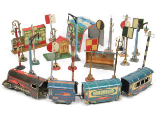 états de 'B' à 'D' - comprend : locomotive 020 avec moteur à clé (fonctionne), tender, fourgon à bagages, voiture voyageurs, 3 bâtiments, tunnel à 2 éléments & 21 signaux - quelques frottements & légères traces d'oxydation par endroits