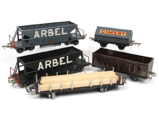 états de 'A-' à 'C' - comprend : wagon à ciment, tombereau, plateau à rancher & trémie 'ARBEL' (2 exemplaires différents) - quelques traces de métal fatigue plus ou moins importantes sur quelques roues - petites retouches par endroits