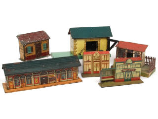 états de 'C' à 'E' - comprend : 3 gares en tôle lithographiée (dont 2 façades), quai de chargement & 2 maisons de garde-barrière - on y retrouve notamment la marque BING - quelques parties plus ou moins oxydées & déformées par endroits