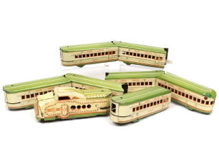 comprend : motrice M-10005 (moteur électrique non testé) & 7 voitures de voyageurs dont une de queue - traces d'oxydation avec petites retouches, déformations & éléments manquants par endroits