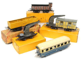 comprend : un wagon tombereau, une voiture de voyageurs pullman (une partie de carrosserie décolorée avec traces d'oxydation, manque couvercle de boîte), tombereau avec vigie (boîte état 'd') & un wagon fourgon de secours (quelques frottements par endroits) & un wagon grue - quelques annotations sur les boîtes