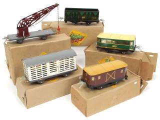 comprend : wagon fourgon, bétaillère (état 'C' avec petites déformations), tombereau, plateau avec grue & voiture de voyageurs - quelques parties plus ou moins ternies