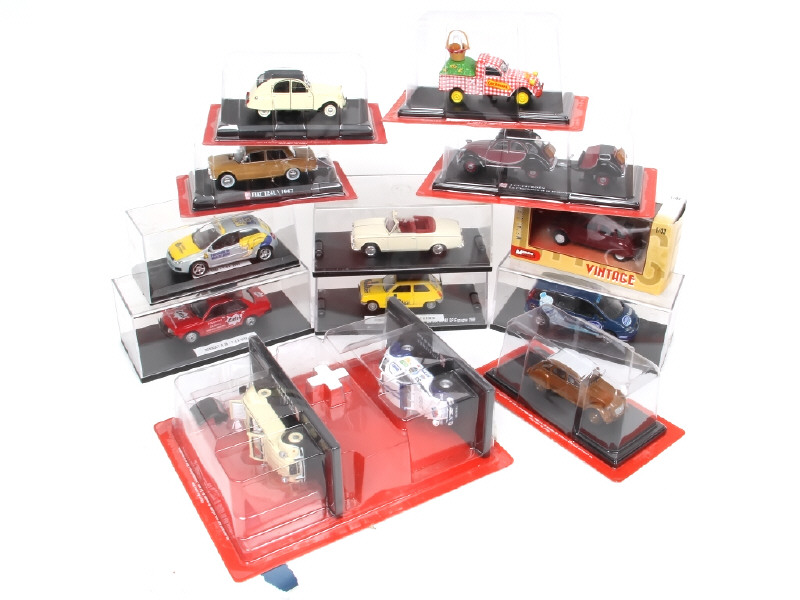 miniatures reproduisant les modèles : FIAT, PEUGEOT, CITROEN & RENAULT - on y retrouve notamment les marques : MONDO, NOREV & EDITIONS HACHETTE - quelques boites non d'origine avec petites fêlures