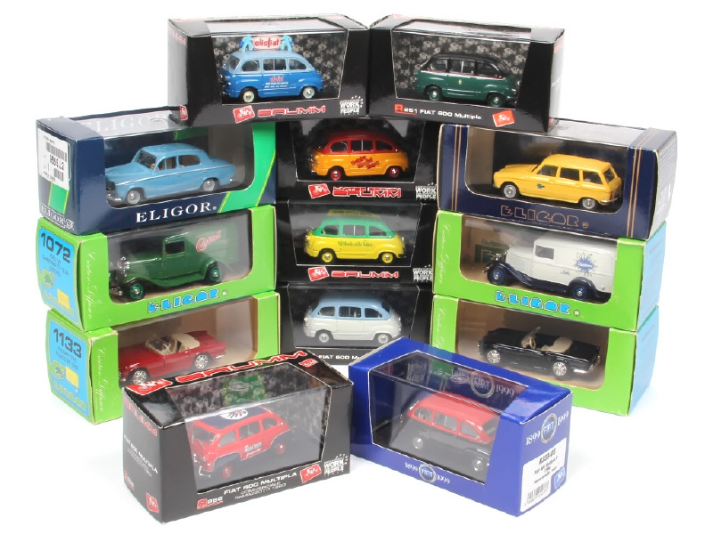 miniatures reproduisant les modèles : FIAT, FORD, TRIUMPH & PEUGEOT - on y retrouve les marques BRUMM & ELIGOR - quelques félures sur les boites