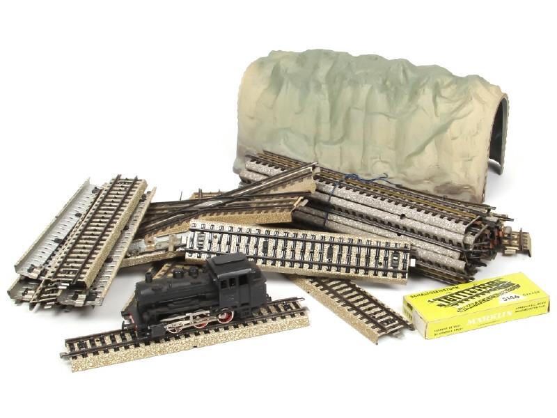 comprend notamment : locomotive à vapeur type 030 (manque une fixation de patin), rails droits, courbes, aiguillage & croisement - avec traces d'oxydation - on y joint un tunnel