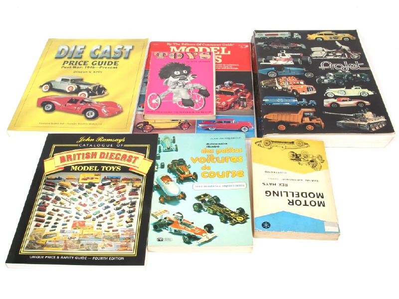 comprend notamment : 'MOTOR MODELLING', 'DICTIONNAIRE ILLUSTRE DES PETITES VOITURES DE COURSE', 'CATALOGUE OF BRITISH DIECAST' & DIE CAST PRICE GUIDE' - traces d'humidité sur certains exemplaires