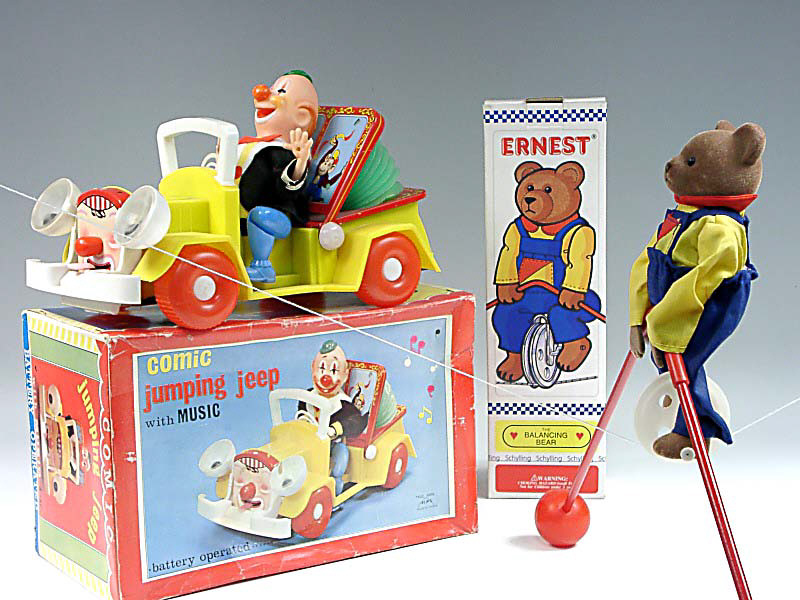 référence 51C du livre de BRIAN MORAN 'BATTERY TOYS' - longueur 30 cm - en action, la voiture avance avec un bruit d'accordéon tandis que les phares & le clown bouge - lorsque la jeep butte dans un obstacle, le clown pousse sur ses jambes pour que la voiture change de direction - les mécanismes fonctionnent - in action, the car moves forward to the sound of an accordion - the clown and the headlights move about - when the jeep hits an obstacle, the clown pushes his feet against the ground, allowing the car to change direction - in working condition