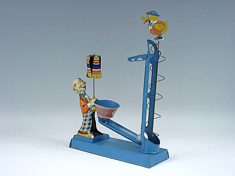 hauteur 34 cm - mécanisme à ressort (fonctionne) - en action, le canard & le parasol du clown tournent - en même temps, une balle monte à l'aide de la vis sans fin puis tombe dans le panier percé du personnage avant de retourner à son point de départ pour recommancer son circuit - pattes du canard ressoudées
