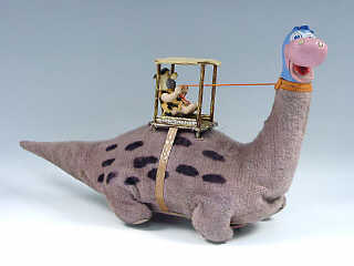 référence 59C du livre de BRIAN MORAN 'BATTERY TOYS' - longueur 45 cm - en action, le personnage bouge d'avant en arrière en tenant par des rênes l'animal qui émet des sifflements - le dinosaure avance en bougeant les pattes, la tête, la queue & en ouvrant la gueule - les mécanismes fonctionnent - petites usures du tissu & retouches de peinture sur le couvercle du compartiment des piles - in action, the charcter moves backward and forward pulling the animal by the reins which lets out a series of whistles - the dinosaur advances moving his paws, head & tail & opening his mouth - in working condition - minor wear to the material & paint touch ups to the battery cage cover