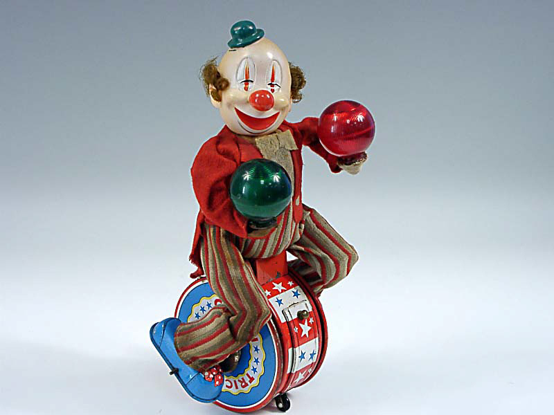référence 51B du livre de BRIAN MORAN 'BATTERY TOYS' - hauteur 30 cm - en action, le clown avance sur une grosse caisse en pédalant tandis que les ballons qu'il tient dans les mains s'allument - les mécanismes fonctionnent - traces d'oxydation sur la grosse caisse - in action the clown moves forward on a big drum, peddling as he goes - the balls he's holding light up - in working condition - traces of rust on the big drum