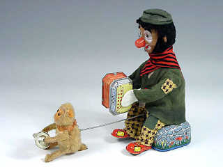 référence 55B du livre de BRIAN MORAN 'BATTERY TOYS' - hauteur 27 cm - en action, le clown joue de l'accordéon tandis que son petit singe joue des cymbales - le personnage bouge la tête - les mécanismes fonctionnent - in action, the clown plays the accrodian as his little monkey plays the cymbals - he moves his head - in working condition