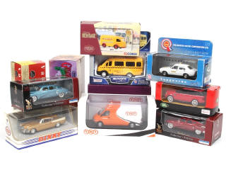 miniatures reproduisant notamment les modèles : RANGE ROVER, TUCKER, RENAULT, STUDEBAKER, FORD & MORRIS - on y retrouve notamment les marques : MATCHBOX, DINKY MATCHBOX, VANGUARD & CORGI TOYS - quelques accrocs sur certaines boites (dont une en état 'c')
