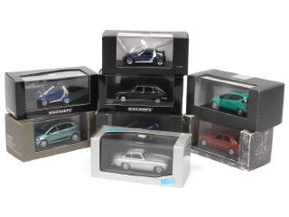 comprend notamment : RENAULT 16, SMART coupé, roadster & MERCEDES-BENZ (5 exemplaires différents) - on y retrouve les marques : MINICHAMPS & MODELS MAX - certaines boites avec très légers accrocs & une autre en état 'b' (frottements importants)