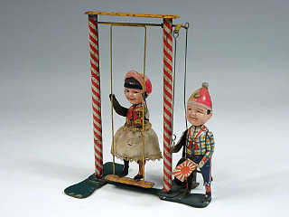 hauteur 21 cm - mécanisme à ressort (fonctionne) - petites traces d'oxydation - en action, la jeune fille fait de la balançoire tandis que le jeune homme actionne celle-ci & agite son drapeau japonais - figurines en tôle lithographiée avec têtes en celluloïd - petites déchirures sur le tissu de la robe
