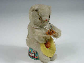 hauteur 15 cm - mécanisme à ressort (fonctionne) - en action, l'ourse tricote - in action, the bear knits - clockwork mechanism (in working condition)