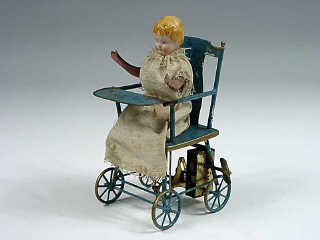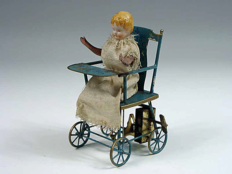hauteur 16 cm - mécanisme à ressort (fonctionne) - en action, la chaise avance tandis que la fillette agite les bras - personnage avec tête de porcelaine - TRES BEAU JOUET DU DEBUT DE SIECLE !