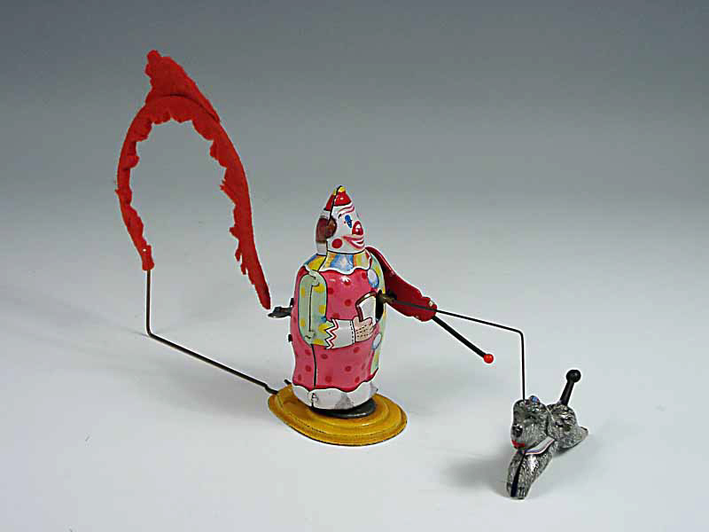 longueur 21cm - mécanisme à ressort (fonctionne) - en action, l'animal tourne autour du clown & saute au travers du cercle enflammée tandis que le personnage agite sa baguette - en tôle lithographiée