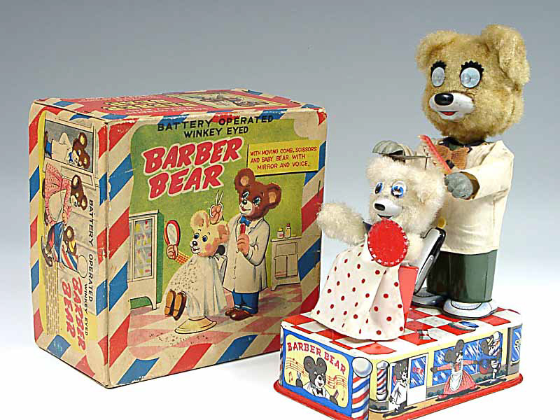 référence 9D du livre de BRIAN MORAN 'BATTERY TOYS' - hauteur 25 cm - en action, le coiffeur coupe & peigne les cheveux de l'ourson qui agite les bras - une fois le travail terminé, l'enfant se penche & se regarde dans le miroir - avec bruiteur - les mécanismes fonctionnent - in action, the hairdresser cuts and combs the hair of the baby bear who waves her arms about - once the work is done, the child leans forward and looks at herself in the mirror - with sound effects - in working condition