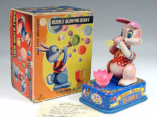 référence 17B du livre de BRIAN MORAN 'BATTERY TOYS' - hauteur 20 cm - en action, l'animal se penche sur un oeuf remplit d'eau savonneuse puis se relève & fait des bulles - les mécanismes fonctionnent - avec notice - in action, the rabbit leans into the egg full of soapy water - then stands back up and blows bubbles - in working condition - with leaflet