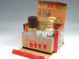 longueur 20 cm - en action, le serveur tourne sur son tabouret vers le tonneau pour remplir son verre puis se retourne vers le client - les mécanismes fonctionnent - avec boîte diorama & 3 verres - une petite restauration sur le couvercle de la boîte - in action, the waiter swivels on his stool towards the barrel in order to fill up his glass, then turns back towards the customer - in working condition - with diorama box & 3 glasses - minor restoration to the box cover