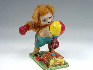 référence 33A du livre de BRIAN MORAN 'BATTERY TOYS' - hauteur 24 cm - en action, l'ours tape dans le punching ball avec ses poings - il bascule son torse d'avant en arrière & sa tête de droite à gauche - les mécanismes fonctionnent - ballon restauré - in action, the bear punches the punching ball - he rocks his body forward and back and his head from side-to-side - in working condition - ball restored