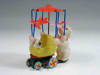 hauteur 15 cm - mécanisme à ressort (fonctionne) - en action, la chienne & son landau décrivent des cercles tandis que le parasol tourne - en celluloïd
