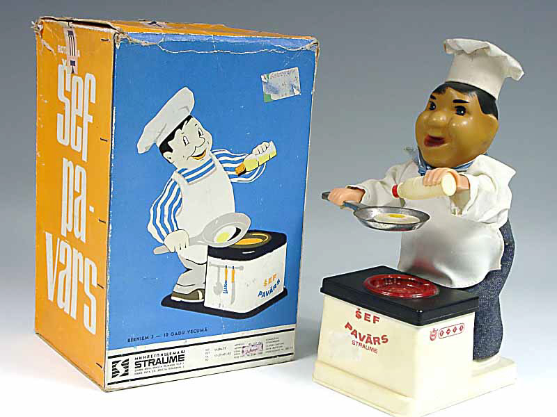 hauteur 29 cm - en action, le personnage cuisine & assaisonne son oeuf tout en le faisant sauter dans la poêle - le fourneau s'allume & le chef bascule de droite à gauche en faisant des grimaces - les mécanismes fonctionnent mais ampoule du fourneau à changer - in action, the character cooks and seasons his egg, flipping it from time to time - the hob lights up and the chef moves from left to right whilst making faces - in working condition - hob bulb to be changed