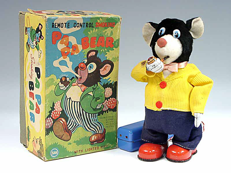référence 23F du livre de BRIAN MORAN 'BATTERY TOYS' - hauteur 22 cm - en action, papa ours avance en fumant sa pipe qui s'éclaire & il recrache la fumée - les mécanismes fonctionnent - une petite tache sur une manche de la veste - in action, Papa bear moves forward smoking his pipe which lights up, he blows out smoke - in working condition - small stain on one of his jacket sleeves