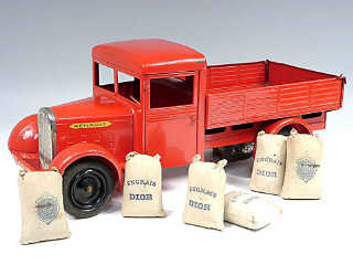 longueur 42 cm - moteur à clef (fonctionne) - état proche de 'B' - version économique sans phare - manque un crochet de fermeture de ridelle arrière - une ridelle légèrement déformée - on y joint 6 sacs en tissus du modèle promotionnel 'ENGRAIS DIOR' - BEL ETAT GENERAL !