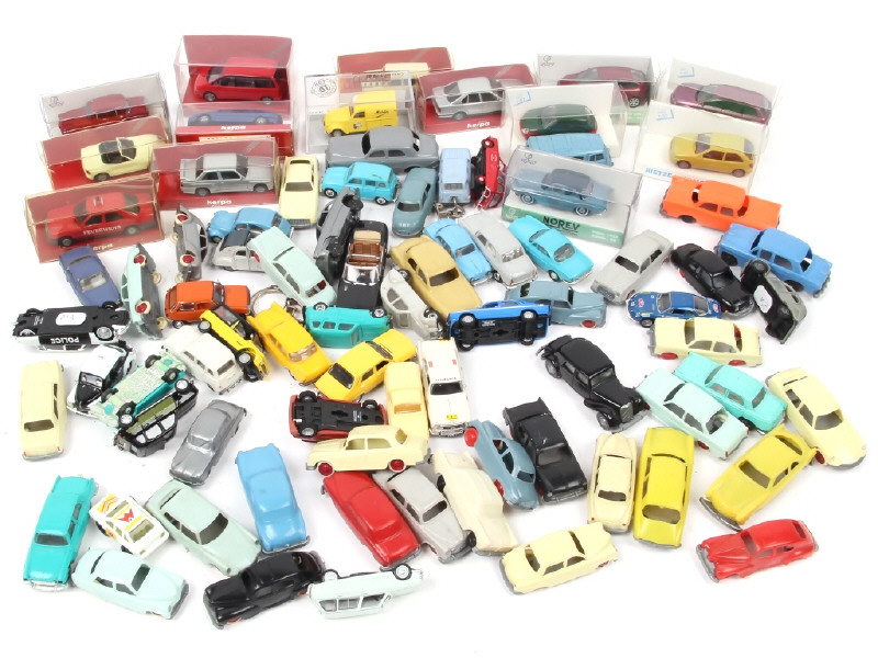 échelle HO - états de 'A+' à 'D' - miniatures reproduisant notamment les modèles : TRABANT, RENAULT, PEUGEOT, SIMCA, CITROEN, - on y retrouve notamment les marques : NOREV, RIETZE, HERPA, CADUM PAX & BREKINA - 2 modèles porte-clefs - possibilités de petits manques & parties cassées - 14 exemplaires en boite