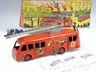 longueur 25 cm - moteur à clef (fonctionne) - version de 1956 avec échelle simple & pompier - sirène 2 tons - base de l'échelle très légèrement déformée - avec notice