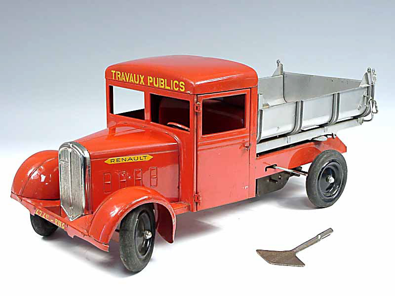 longueur 42 cm - moteur à clef (fonctionne) - avec clef - version sans phare - mention 'TRAVAUX PUBLICS' au pochoir sur le fronton de la cabine - benne avec mécanisme de levage - TRES BEL ETAT GENERAL !