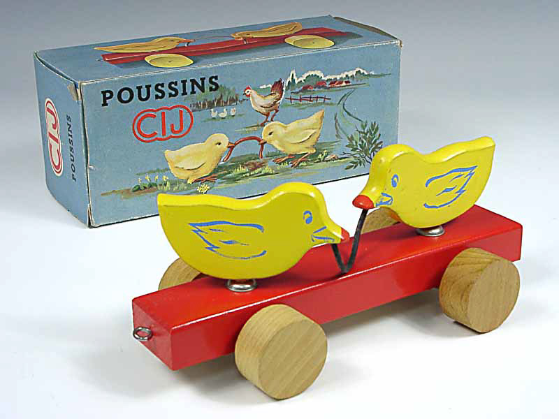 C.I.J. (FRANCE) 30/8 Poussins sur chariot à roues jaune & rouge